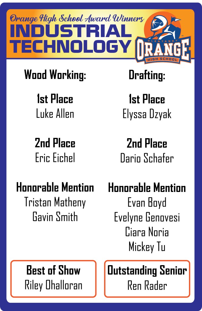 To see past work, look within the galleries at the top of the page you will find artwork, woodwork, architecture, and drafting from students at Orange Middle School and Orange High School, grades 6-12.